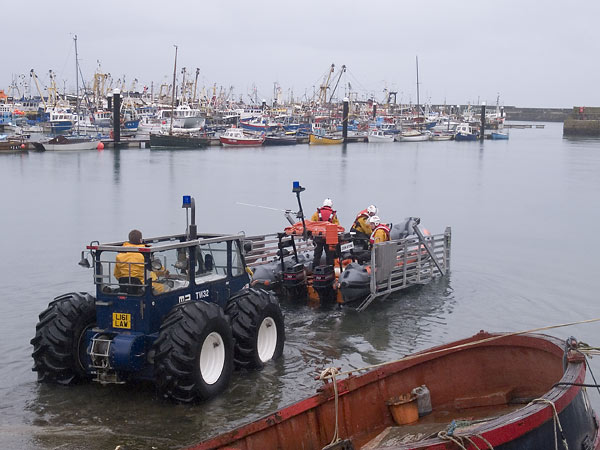 5) the data from the tidal gauge beside the lighthouse is used as the tidal datum in the drawing of Admiralty charts – St Michael's Mount is just visible in the background; 6) the hulls blend nicely with the water – we will probably change the colour scheme to something more photogenic before we take it upcountry for demonstrations; 7) the maritime rescue service in the UK is run by the RNLI (Royal National Lifeboat Institution) and it is 'manned' by volunteers and entirely funded by donations – here the 'Inshore Rescue Boat' is being launched for a practice ... photos by Freya Laughton