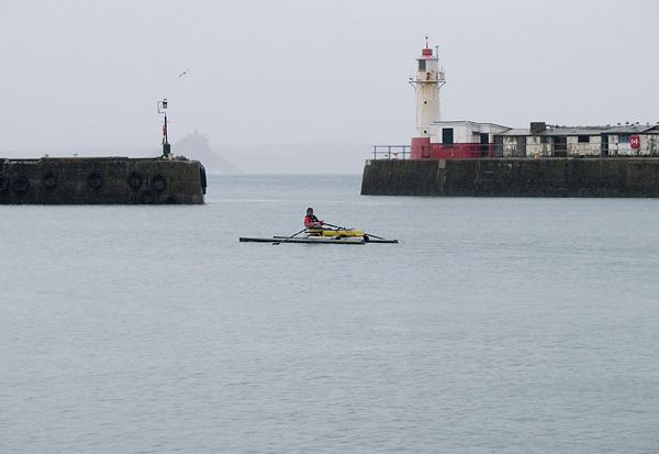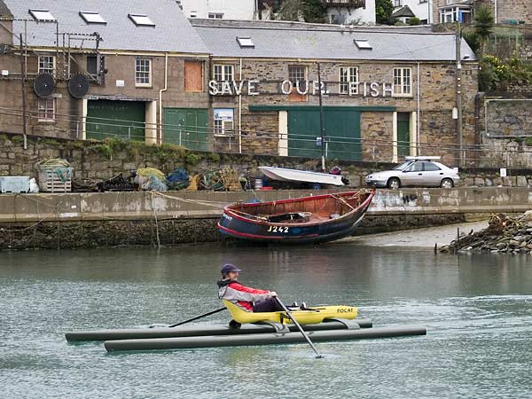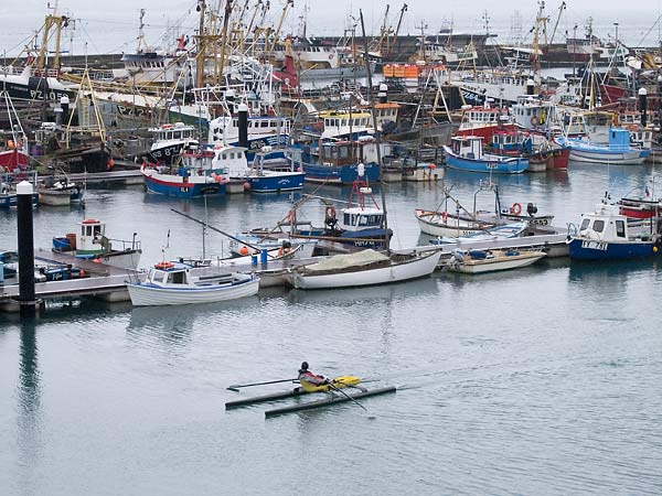 1) the smaller boats don't go out on Sunday, so the harbour was full; 2) the flatest water I've been on for a long time; 3) this picture shows the novel ROCAT stroke quite well – the arms are straight, and your hands stationary during the power stroke, while you heave with your feet, pushing against the seat back;4) I think Newlyn has the highest fish landings in Britain, but the European Union regulations and controls on fishing give UK fishermen a very hard time – the sign in the background relates to this;