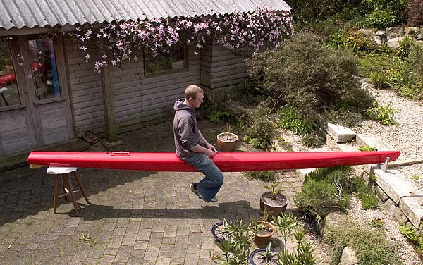 Carbon fibre is a remarkable material which has extremely high tensile and compressive strength for its weight, but it also has very poor impact strength and it is extremly expensive. For the hulls we use a high specs biaxial non-crimp glass; this just means that the fibres are stitched together, rather than woven. If you are trying to use a material's ultimate tensile strength, you lose out if the fabric is woven – the fibres can only achieve their max strength when they are straight, which they are not in woven fabric; see the diagram on the right. When you combine this glass with Soric resin infusion medium and epoxy resin, you get a skinny shell which is light, strong and very tough. In the swanky hull strength picture, the hull is supported at the ends, and easily carries Anthony's 95kg. Before we add the built-in buoyancy, the sockets, the skegs and the rubbing strips, these hulls weigh just 7.1kg – not bad for a 5 metre glass fibre hull! One of the reasons they're so light is that they are (apparently uniquely) made in one piece – perhaps we should make more fuss about that?