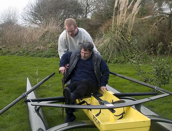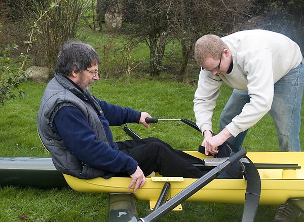 This afternoon, it stopped raining for a while, and I had the crazy idea of finding out whether it is possible to row a ROCAT with an injured back. Anthony set the demonstrator up in the field, and I hobbled out to put my theory to the test.
