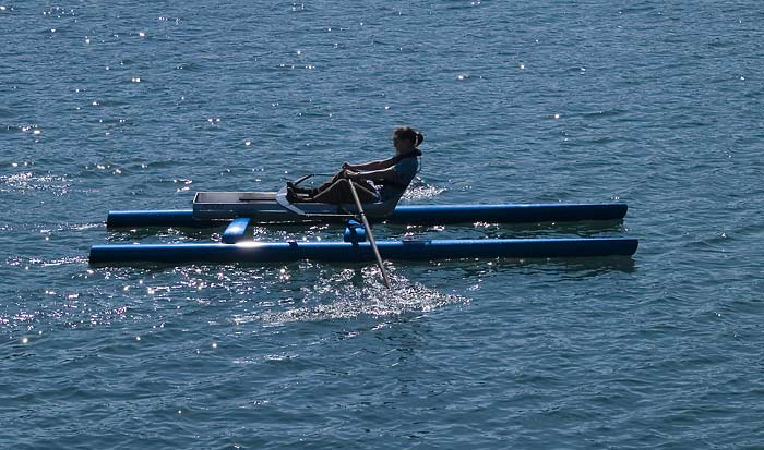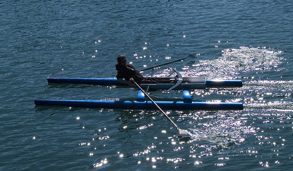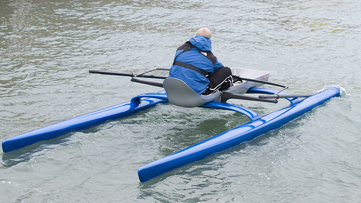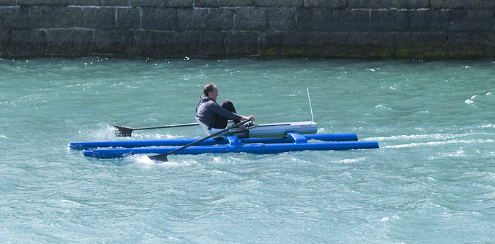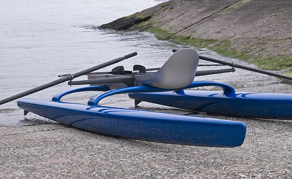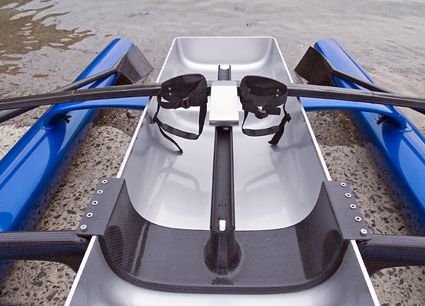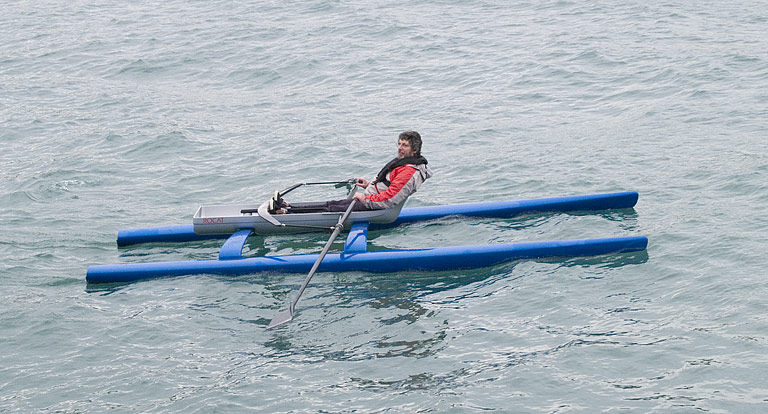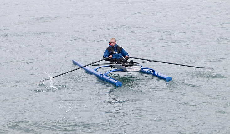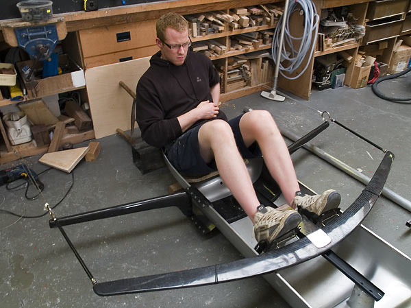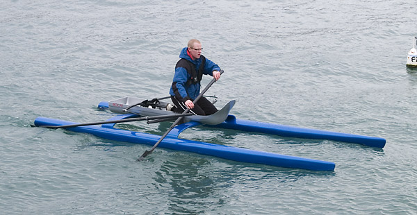 21 May 2006 The seatdeck moulding cycle has gone very smoothly, and we have three seatdecks trimmed and ready for paint. Jake Frith came down from Southampton yesterday to try the boat. Jake, who is an experienced coastal sculler, has been following the ROCAT's progress since he saw the boat on the 'Concept Boat' stand at the 2003 London Boat Show. Hearing that we planned to take the ROCAT over to the 'British Coastal Challenge' in Guernsey in September, he tentatively volunteered to row it for us. Fortunately for the trial, the rain had passed over and the sun shone. There was a brisk 30mph breeze however, but it was offshore so he didn't get to experience how the boat handles a big sea. When he came in he told me that he liked the boat, but didn't think that it would do very well in Guernsey the way it is I can't deny that this came as quite a blow. With Anthony's help, I believe I have produced the only fast rowing boat that can be safely, and enjoyably, rowed on a very rough sea is it very greedy of me to want it to be able to beat other open-water boats on speed too? Richard (boat #2) has cautioned me to moderate my expectations, speedwise, but I reason thus: So far as I could work out when I designed the hulls in the first place, the ROCAT has a little more (perhaps 3-5%) 'wetted surface drag' than a sculling boat; but its extremely slim hulls have practically no 'wave-making drag', and the hullform is very clean and hydrodynamically sound. On top of that, the rig is more powerful because you have a solid back to push against, you can exert more force on the footbar which is transmitted directly to the oar, (which can be easily demonstrated with a leg press in a gym, or a recumbent bicycle). So with the overall hydrodynamic drag being similar, perhaps a little more, but the rig being more powerful, it seems reasonable to suppose that there would not be a lot of difference in speed. A number of things that Jake suggested derive from a sculler's mindset, and were either not possible or, because they would require new main moulds, not practical on grounds of cost. However, his first observation that the rig is too high geared does ring true, and is easy to remedy. There are any number of rigging charts for sculls, but none for a ROCAT rig, which is quite different. It's going to be higher geared than a conventional rig because you can push harder with your back supported (just as a more powerful engine can pull a higher gear in a car), but how much higher? it would appear that I have gone too far. We will set up one of the new Dreher oars with less outboard (inboard is fixed) and see if it's better. Although ROCATs racing ROCATs will happen in due course when there are enough to make a race, it would be good if ROCATs could also be competitive with the best open-water boats around. The trouble is, the races in which it would leave the competition standing, when it's blowing force 5 or 6, will be cancelled as unsafe for monohulls! ... CL ... 1) three seatdecks; 2&3) the coastal sculler tries the ROCAT in a stiff breeze. |