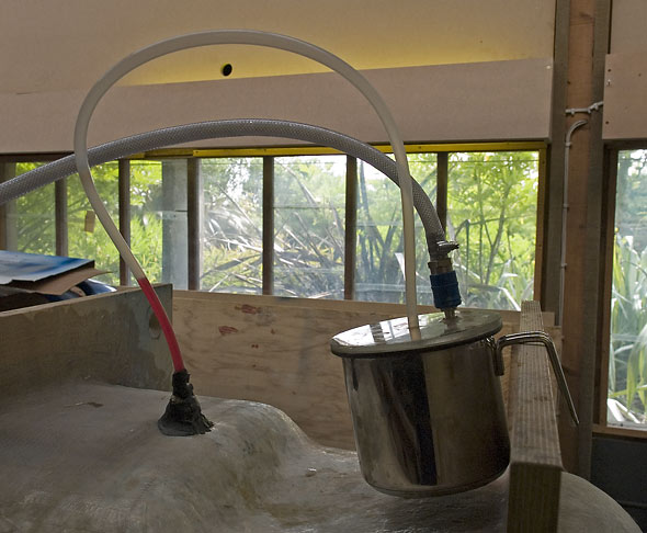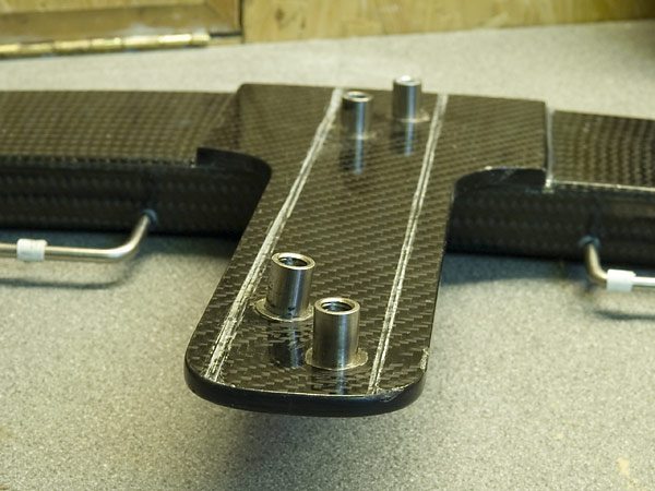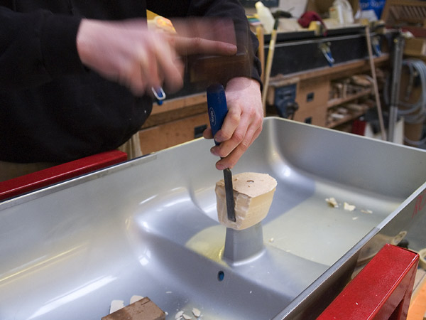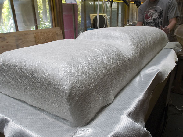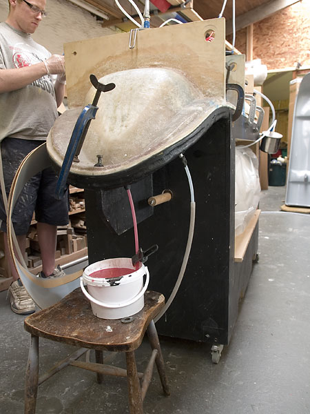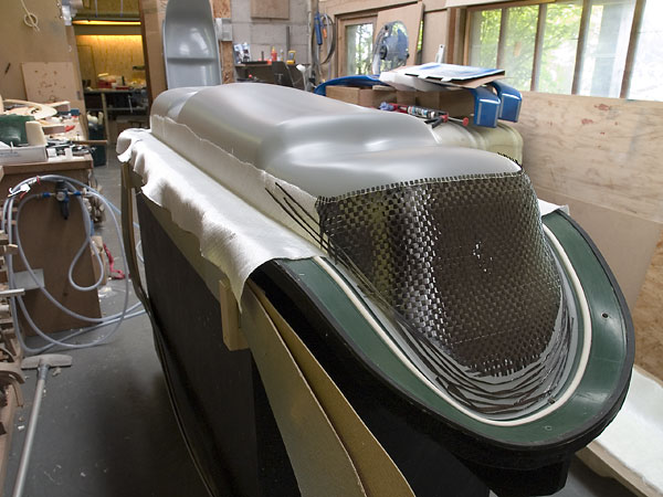 12 May 2006 A lot of the visitors to this website come to read about the technology we use in producing the ROCAT so, for this post, I crave the indulgence of the rowers while I go through the production of a seatdeck. Because we are not using gelcoat, we have found that spraying epoxy primer into the mould works well, and we can spray it on to the Frecote 770 semi-permanent release agent without problems. We use Saercore glass to reinforce the seatdeck, with some additional carbon around the back of the seat. Saercore (which is similar Rovicore) comprises random strands of glass either side of a 'resin infusion medium'. It's an excellent product which is largely responsible for the seatdeck being the easiest, and most reliable mould. We use a preform tool (a rough copy of the mould) to shape the Saercore, which is extremely good at conforming to quite complex double curvature shapes. The seatdeck mould is a 'matched mould' which has a 2.5mm cavity between the top and bottom mould surfaces. Once the layup is complete, the top is eased on and the vacuum clamp applied to hold it all very tightly together. The epoxy resin is mixed and degassed to remove the air that is introduced during the mixing process. For this mould we use a 40% vacuum in the mould cavity to draw the resin into the dry reinforcement. Due to the complexity of the shape, we use two vac ports; these have catch pots to eliminate the risk of resin being pulled into the vacuum pump. When we have resin showing at both the vac ports, we clamp off the resin feed; back off the cavity vacuum; take the vac port tubes out of the catch pots and 'head' them raise them up with resin in to ensure no air gets into the part. The seatdeck is then left to cure overnight. We are coming to the conclusion that, with the present space and limited staff, it makes most sense to produce the boats in batches of three. So we have made the seatdecks for boats 1 and 2, and will produce 3's next Monday. A number of people who have tried the ROCAT have observed a tendency to slip down in the seat I am slightly bemused by the fact that I never feel that, but it was something we had to tackle. So we set up proto 4's seatdeck in the workshop to get Anthony to identify what's happening so we can devise a remedy. We also used the opportunity to test the strength of the rowlocks under a static load (which is far more than one can apply with oars). The rowlocks checked out fine, and we found that some additional padding at the front of the seat seems to cure the slipping down problem. We also chopped up proto 3's seatdeck in order to establish if the rake of the seat back was the cause very fortunately, Anthony decided that the present rake is good. proto 4 is back in action, and I aim to do another longish row this weekend ... CL ... 1 & 2) laying up the seatdeck with carbon and Saercore; 3) infusing the resin we tint it to make it easier to see in the translucent plastic tube; 4) the resin showing to indicate that the cavity is full; the catchpot is on the right; 5) 'we have a good part' we are still so new to this that it's great when it happens! 6) testing the seatdeck and rowlocks in the workshop 7 May 2006 The web hosting move went remarkably smoothly, much to everybody's relief I have heard tales of domains getting lost in cyberspace for days. So far, then, I'm well pleased with 'clook.net' their customer service/support seems excellent. We have just taken delivery of the 'stiff' oar shafts from Dreher and what a difference! They look and feel really good, and I reckon we need have no further concerns about breakages with them. They are quite oval in cross section, with additional unidirectional carbon on the leading and trailing edges, where it's needed. We also ordered a pair of their rounded 'Apex R' blades to evaluate they look quite strange, but are beautifully made (as we've come to expect from Dreher), and we are looking forward to trying them. I have been asked how we make the foam polyurethane blanks which we use in all our carbon fibre parts I described it ages ago, so it's in the archive, but I thought I'd just recap. The normal way to make shapes with PU foam is to mix the two components, pour the mixture into a mould, and close the lid. We tried that, but the quality of the foam was awful. Then, quite by accident, we discovered that the quality of the foam is greatly improved if it foams outside the mould, and is forced into the mould through small pipes. It's very low-tech, but produces clean foam of very even consistency. Interestingly, the foam that erupts from the vents is even better quality, but we can't work out how to achieve that nor can we get a good explanation of why that's the case. I love strange phenomena! Anthony had cast a crossbeam blank, and it was sitting on the hull mould when he resprayed the hulls. When he'd finished, he noticed that the overspray had settled on the crossbeam blank in the most extraordinary patterns. Must be static, but why on earth did the dust settle in those shapes? ... CL ... 1) preparing the crossbeam foam mould; 2) after it's foamed: 3-5) the stage patterns on a crossbeam foam blank after Anthony resprayed the hulls; 6) after some work in Photoshop, this one could hang in a gallery! 5 May 2006 The ROCAT website is moving from 'NetPivotal' to 'clook' I hope the transfer will be smooth! ... CL 30 April 2006 As regular visitors will know, we make all the carbon fibre components inside closed moulds, using a core of cast polyurethane foam. We were so pleased when we managed to find a low-tech, but very effective way of making these foam blanks and, with practice, Anthony is producing good foam. But the other day, we noticed that a bubble was appearing on the surface of David's footbar after it had been heated for post-curing. We eventually worked out that, although the foam looked good on the outside, it contained pockets of air one of these had expanded with the heat, and distorted the softened ep